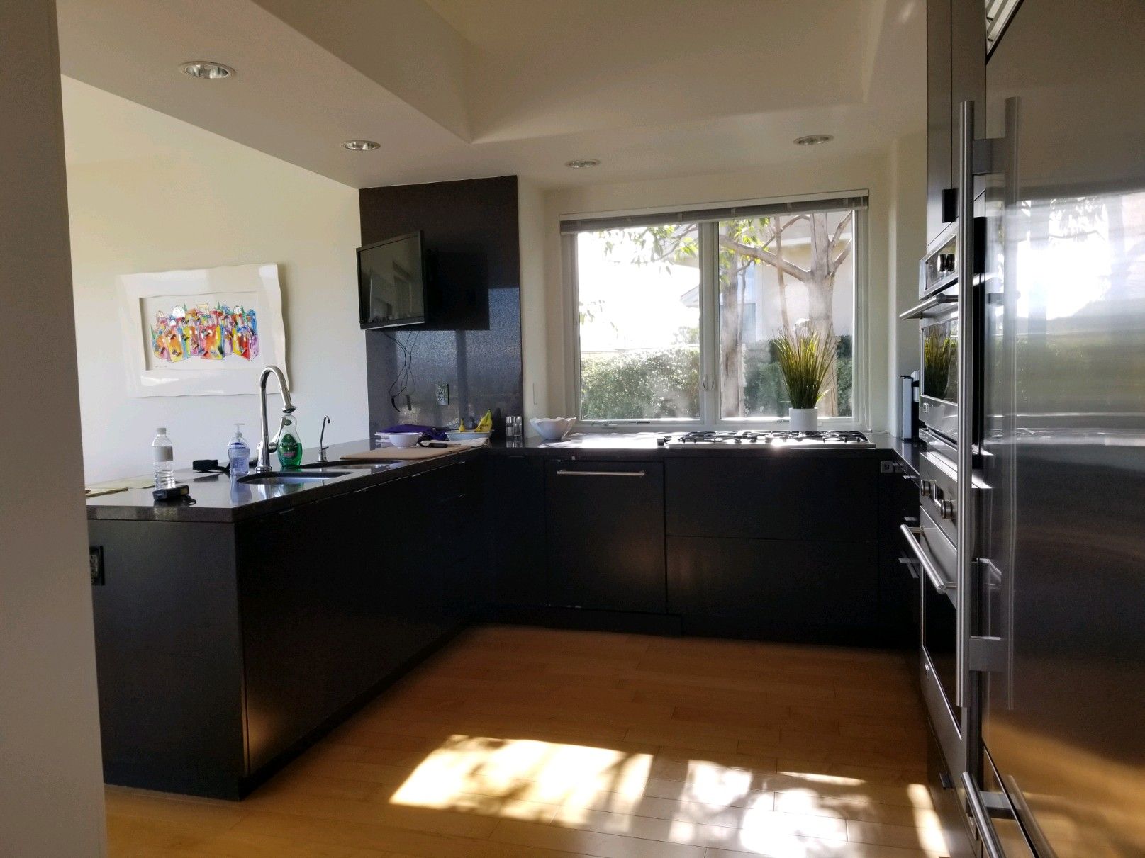 - Quartz slab counter, black splash and around windows