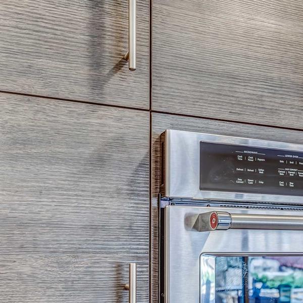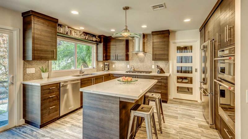 The Dawson custom kitchen remodel features trendy European style cabinetry and a kitchen island with seating, storage and built-in refrigerator.