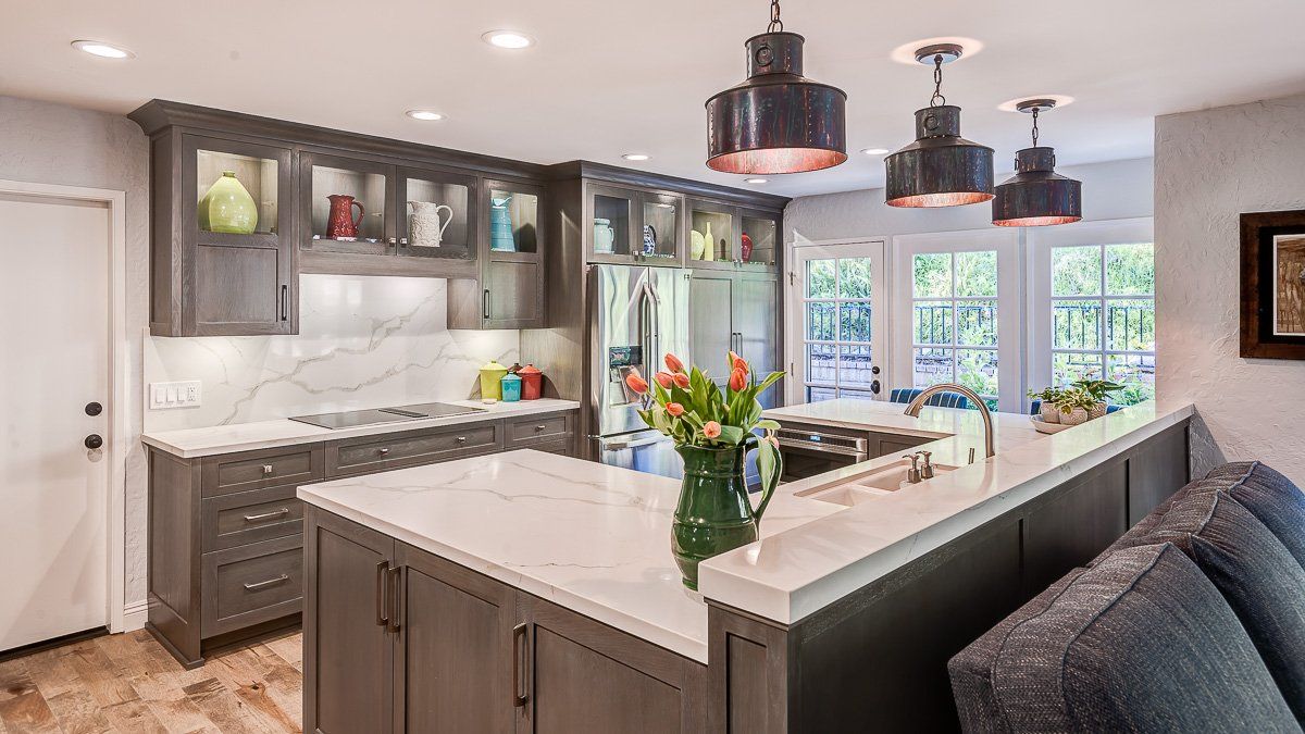 We designed this custom kitchen renovation for our clients in Monrovia, CA. Their new Craftsman style kitchen features furniture-grade custom white oak cabinetry, quartz countertops, and island. The large island features built-in storage and appliances.