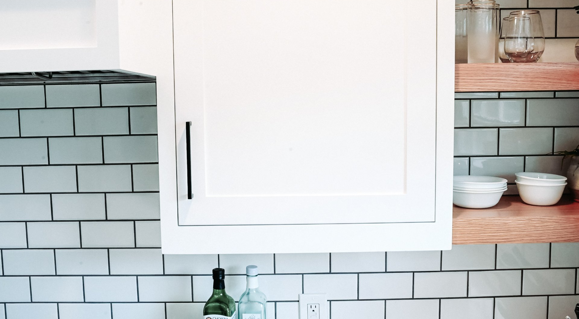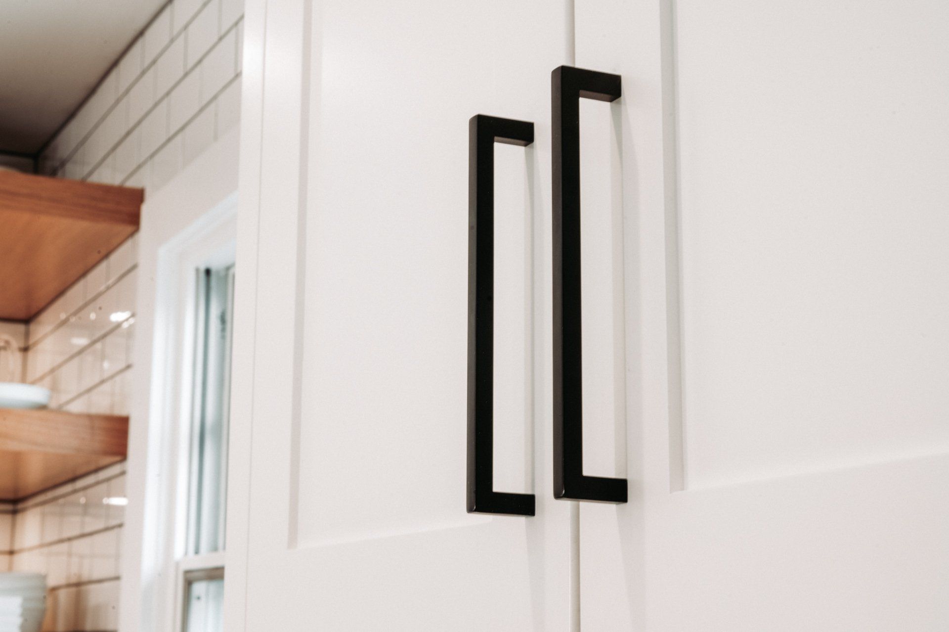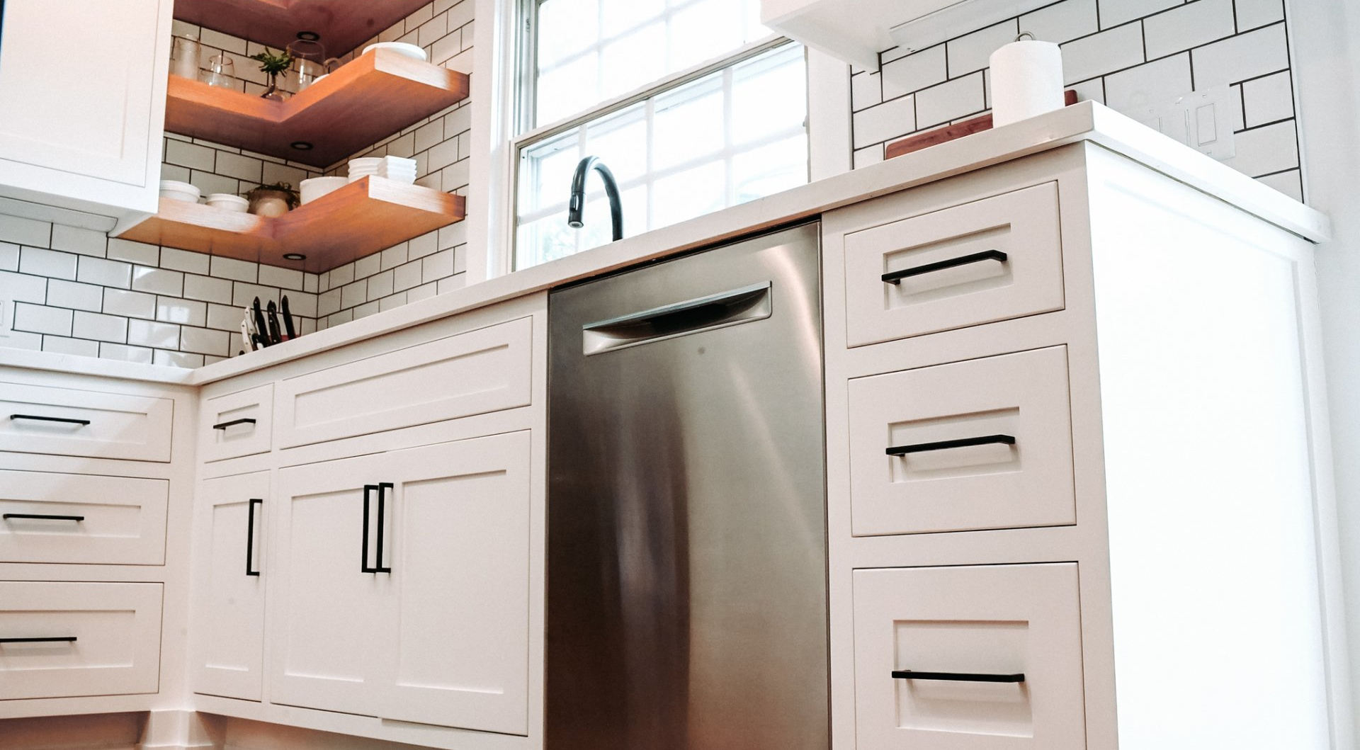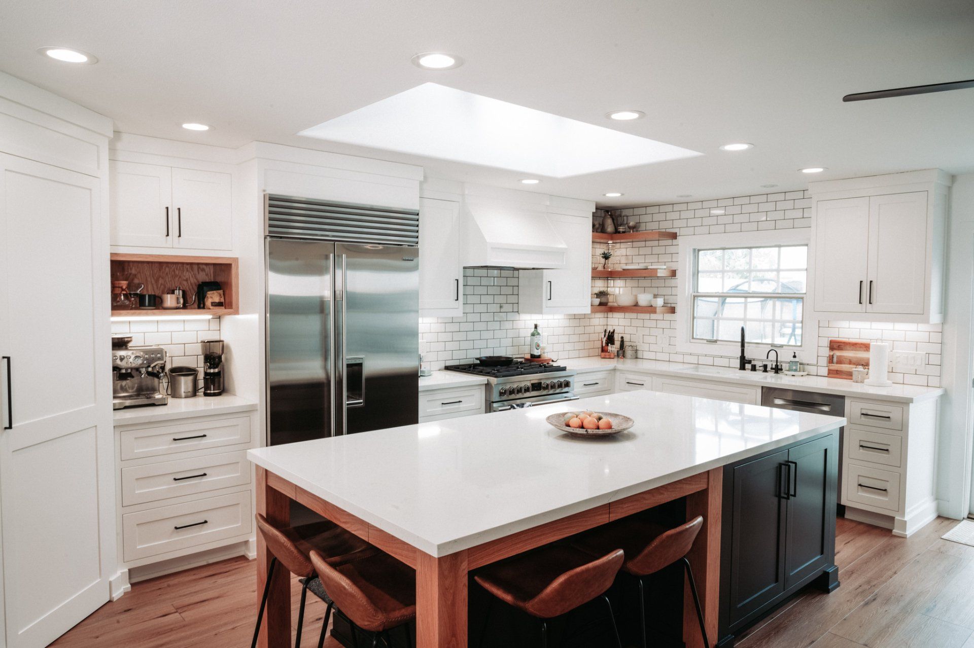 Our custom craftsman style kitchen remodel in Huntington Beach features the clean minimalist look of all white cabinets with white countertops and subway tile, accented by a black island, black hardware and white oak shelves.