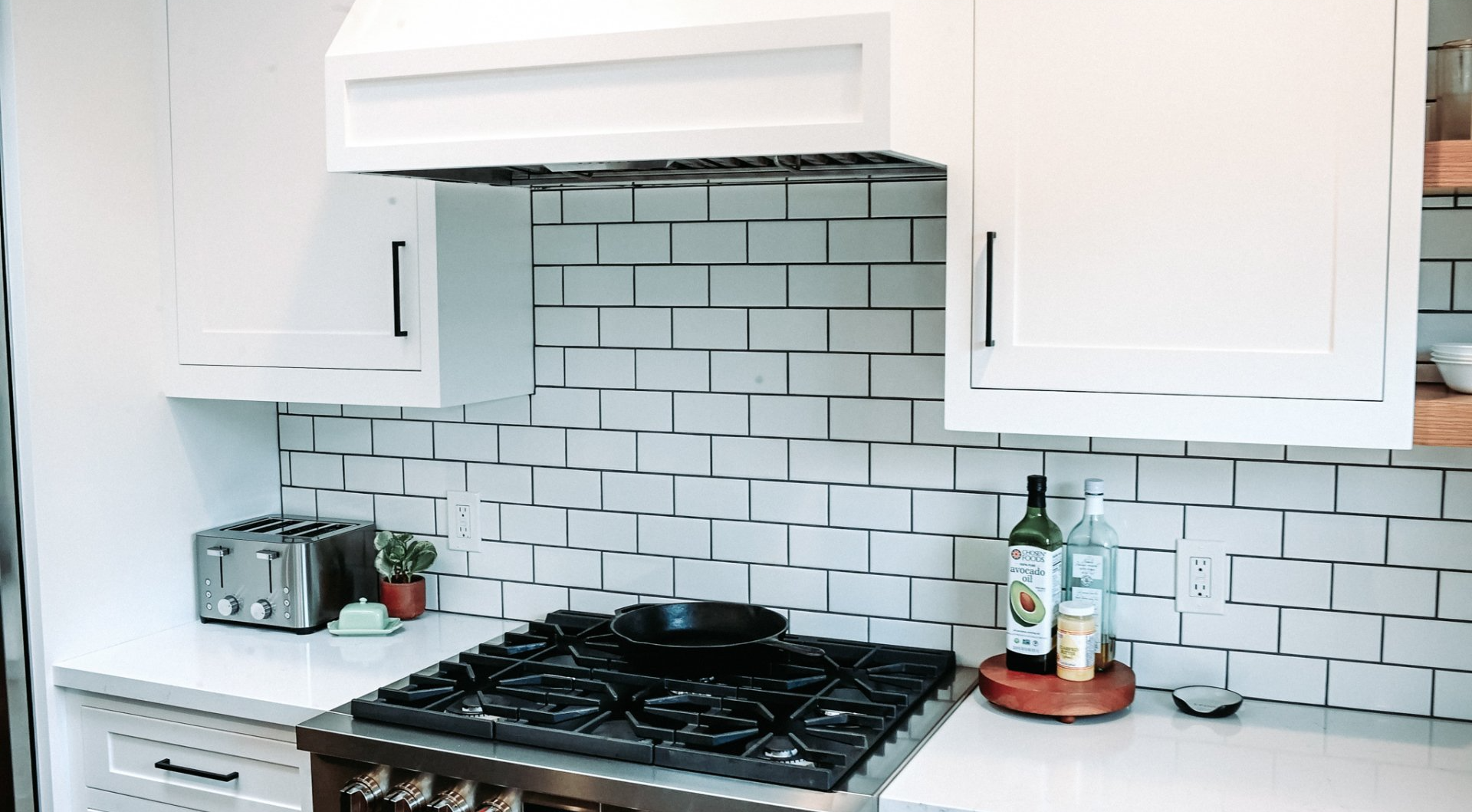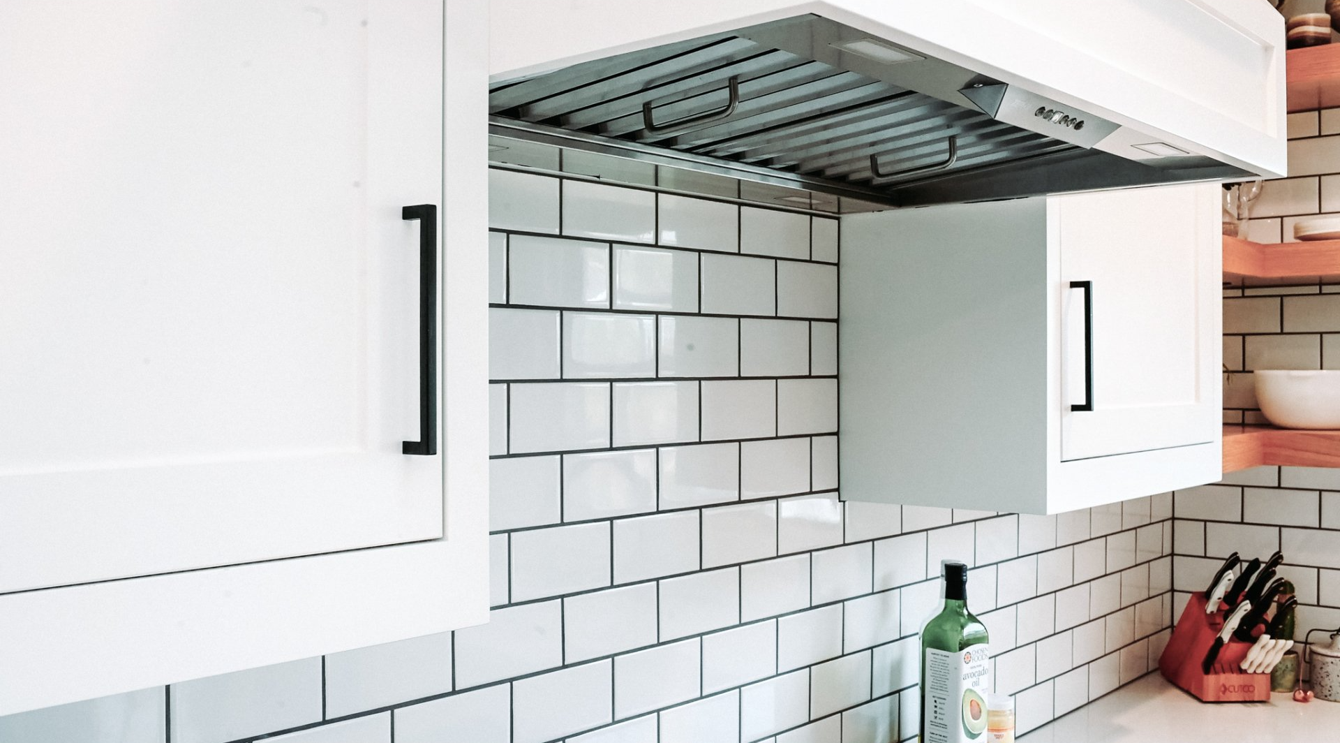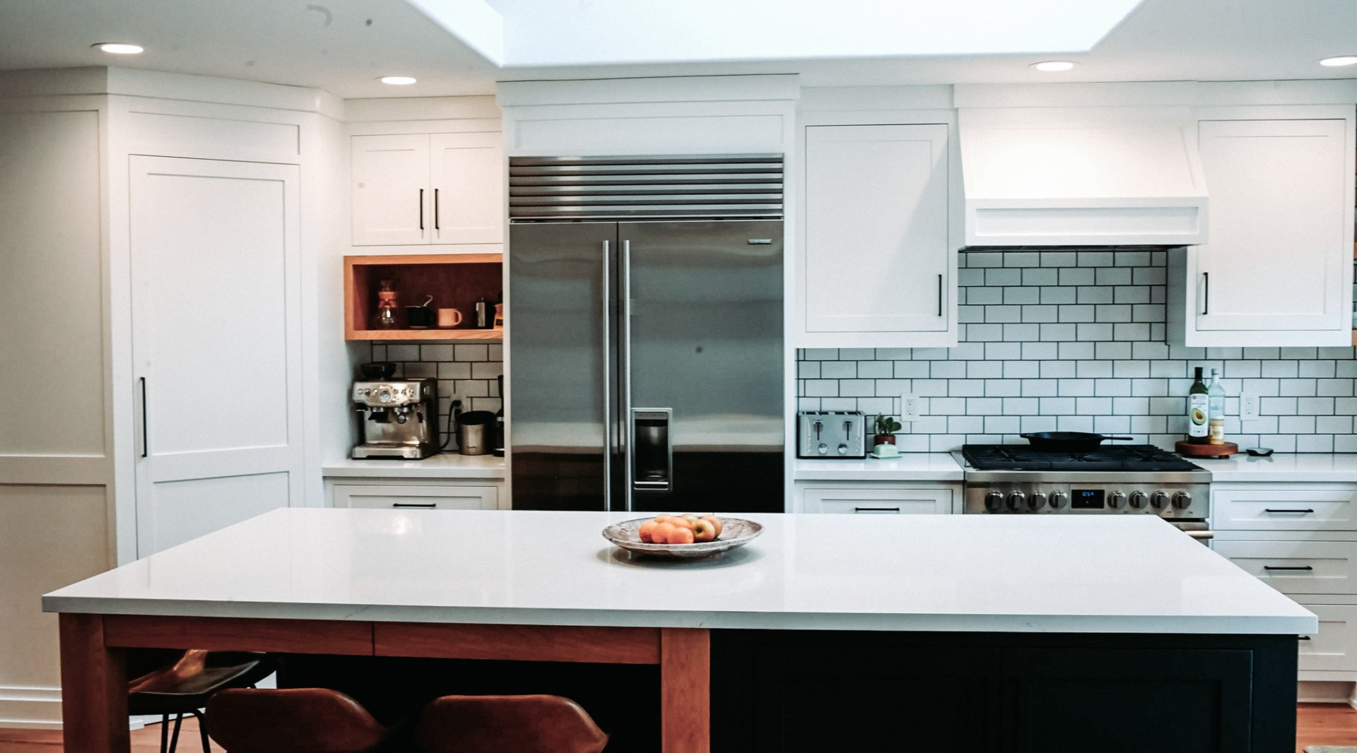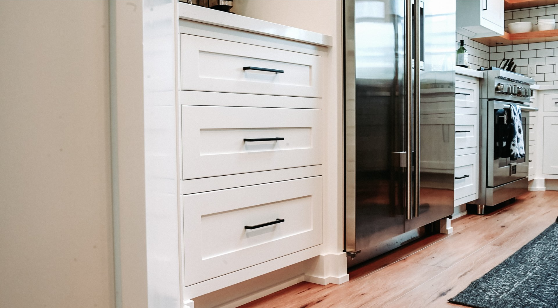 Our custom craftsman style kitchen remodel in Huntington Beach features the clean minimalist look of all white cabinets with white countertops and subway tile, accented by a black island, black hardware and white oak shelves.