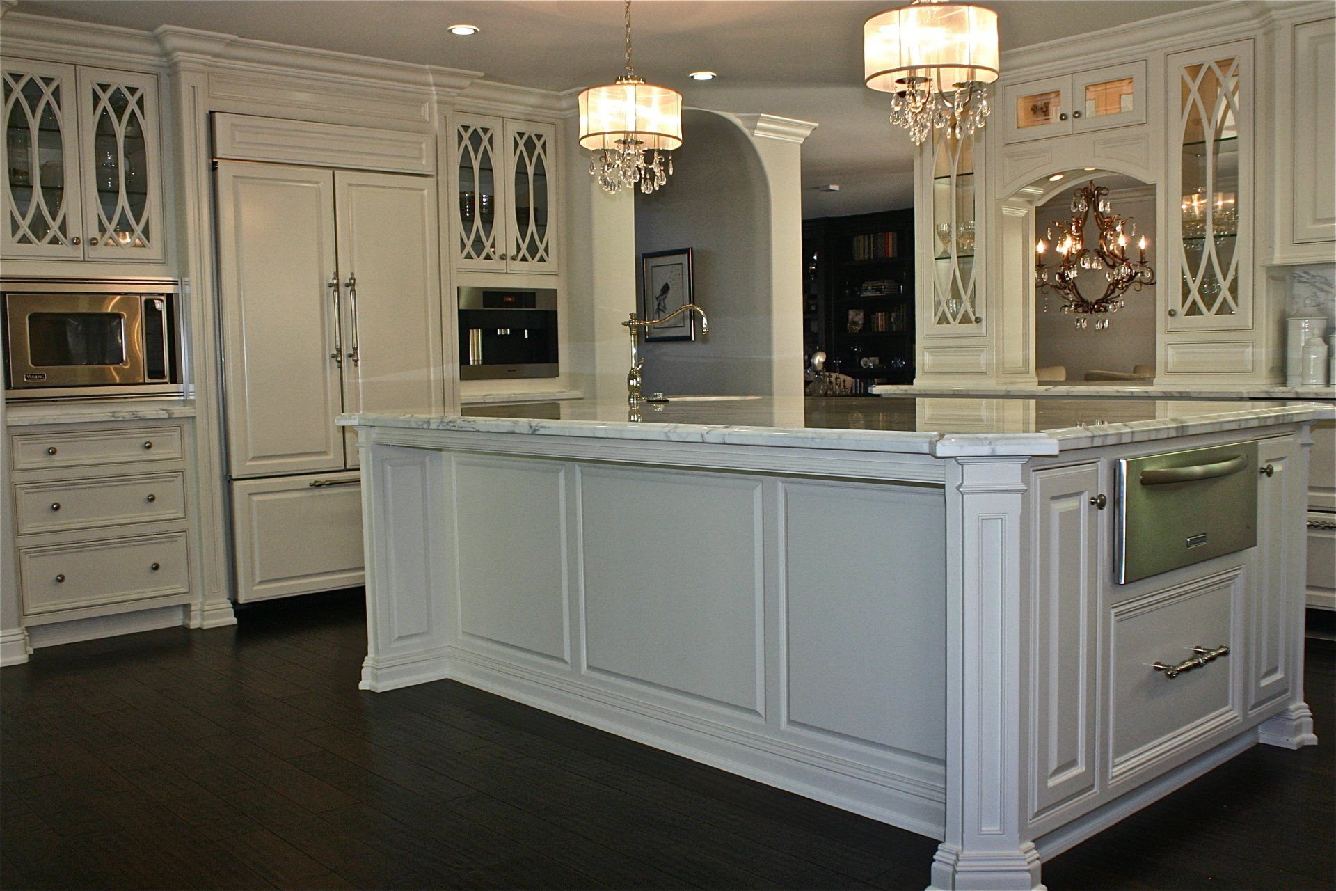 We designed this elegant craftsman style kitchen for our clients in Laguna Niguel, CA. The custom cabinets and kitchen island are furniture grade with upgraded gothic mullioned doors, and white Carrara marble countertops.