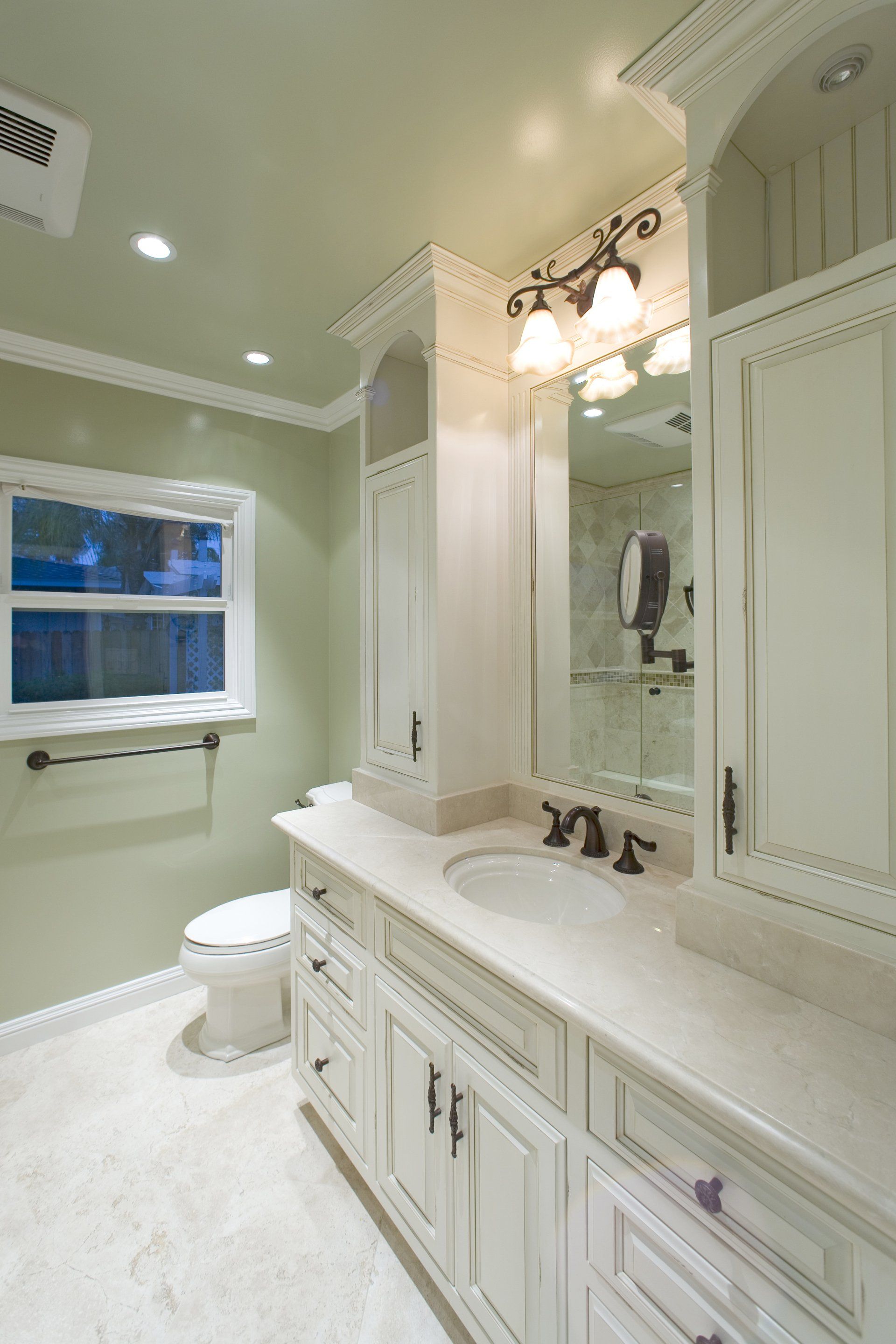 We designed this custom bathroom with white lacquer finish cabinetry for our clients in Fullerton, CA. This project features Travertine tile flooring, and shower surround.